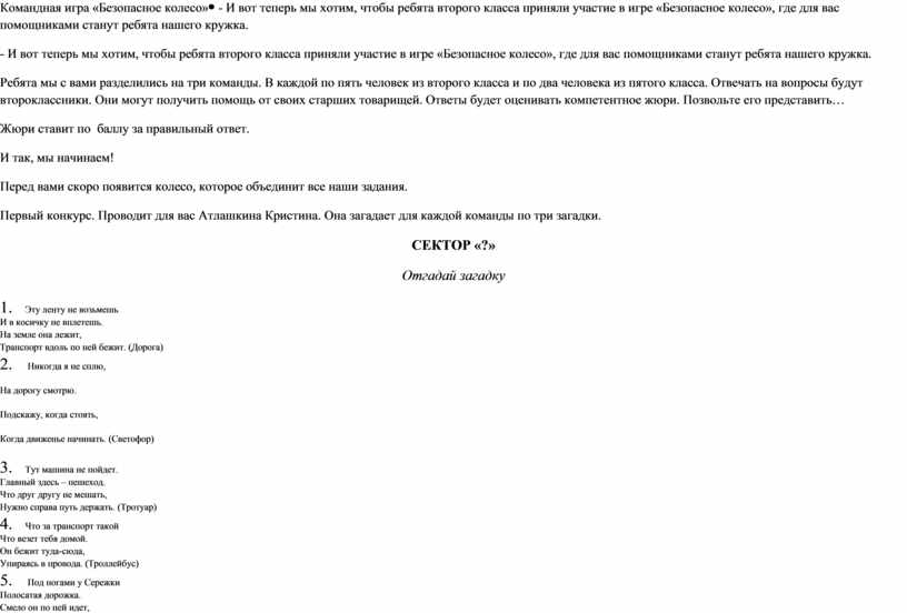 - И вот теперь мы хотим, чтобы ребята второго класса приняли участие в игре «Безопасное колесо», где для вас помощниками станут ребята нашего кружка. Ребята мы с вами разделились на три команды. В каждой по пять человек из второго класса и по два человека из пятого класса. Отвечать на вопросы будут второклассники. Они могут получить помощь от своих старших товарищей. Ответы будет оценивать компетентное жюри. Позвольте его представить… Жюри ставит по баллу за правильный ответ. И так, мы начинаем! Перед вами скоро появится колесо, которое объединит все наши задания. Первый конкурс. Проводит для вас Атлашкина Кристина. Она загадает для каждой команды по три загадки. СЕКТОР «?» Отгадай загадку 1. Эту ленту не возьмешь И в косичку не вплетешь. На земле она лежит, Транспорт вдоль по ней бежит. (Дорога) 2. Никогда я не сплю, На дорогу смотрю. Подскажу, когда стоять, Когда движенье начинать. (Светофор) 3. Тут машина не пойдет. Главный здесь – пешеход. Что друг другу не мешать, Нужно справа путь держать. (Тротуар) 4. Что за транспорт такой Что везет тебя домой. Он бежит туда-сюда, Упираясь в провода. (Троллейбус) 5. Под ногами у Сережки Полосатая дорожка. Смело он по ней идет, А за ним и весь народ. (Зебра) 6. На обочинах стоят, Молча с нами говорят. Всем готовы помогать. Главное – их понимать. (Дорожные знаки)
