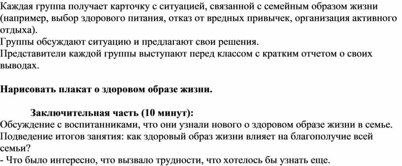 Каждая группа получает карточку с ситуацией, связанной с семейным образом жизни (например, выбор здорового питания, отказ от вредных привычек, организация активного отдыха).