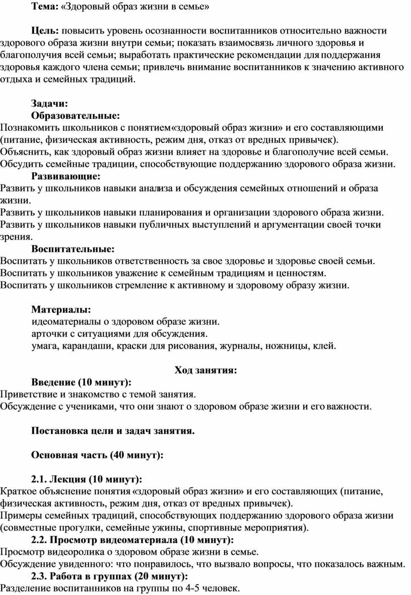 Цель: повысить уровень осознанности воспитанников относительно важности здорового образа жизни внутри семьи; показать взаимосвязь личного здоровья и благополучия всей семьи; выработать практические рекомендации для поддержания здоровья каждого члена семьи; привлечь внимание воспитанников к значению активного отдыха и семейных традиций.