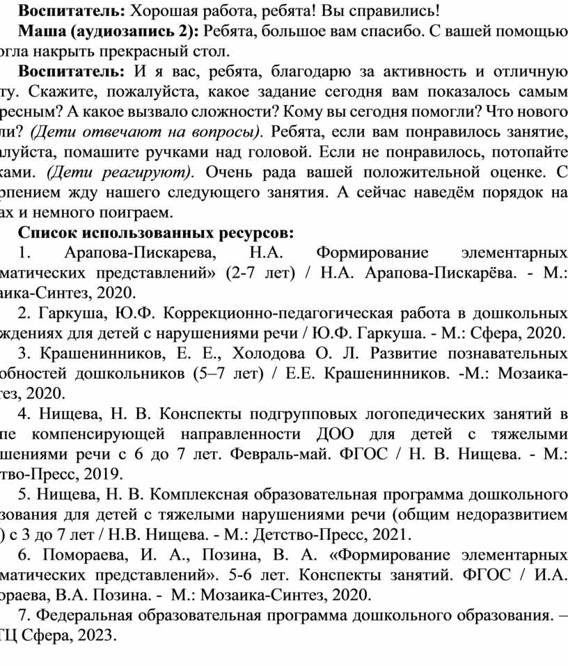 1. Арапова-Пискарева, Н.А. Формирование элементарных математических представлений» (2-7 лет) / Н.А. Арапова-Пискарёва. - М.: Мозаика-Синтез, 2020.