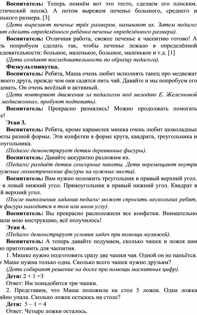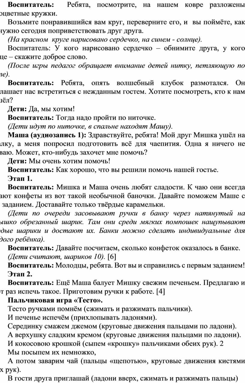 Оборудование и материалы: сенсорный пакет (внутри гель, блёстки, геометрические фигуры (круг, квадрат, треугольник, прямоугольник), сенсорная банка (на банку натянут шарик с обрезанной ножкой, внутри банки помпошки и твёрдые шарики) , кинетический песок, три формы для печения (большая, средняя, маленькая), игрушка Маша, музыкальная колонка, клубок ниток, чайные ложки и игрушечные чашки, магнитные цифры.