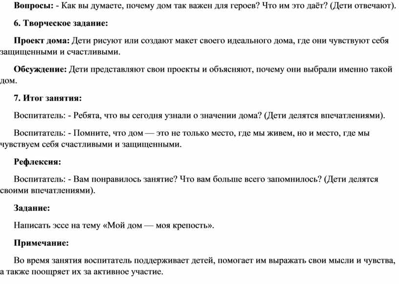 Воспитатель: Дом — это не просто место, где мы живем. Это место, где мы чувствуем себя защищенными, где царит уют и эмоциональная теплота. Что вы думаете об этом? (Дети делятся своими впечатлениями).