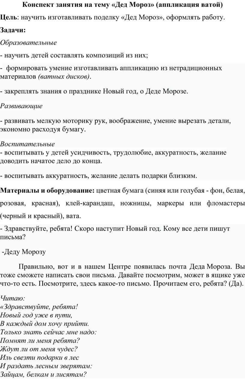 Конспект занятия на тему «Дед Мороз» (аппликация ватой)