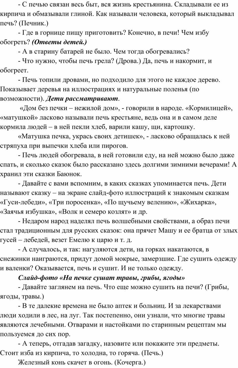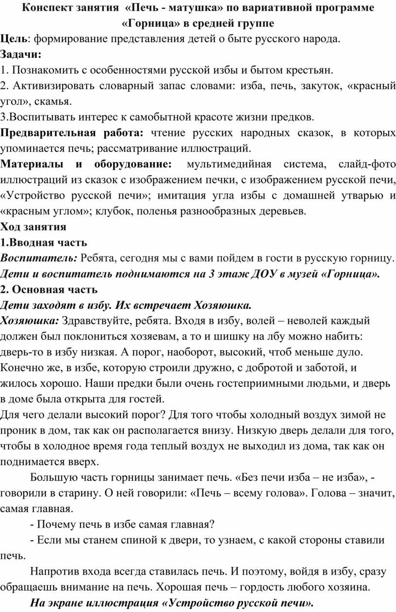 Конспект занятия «Печь - матушка» по вариативной программе «Горница» в средней группе