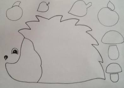 нарисованным контуром ёжика (15 см на 20 см), нарисованными яблоками, грибами и