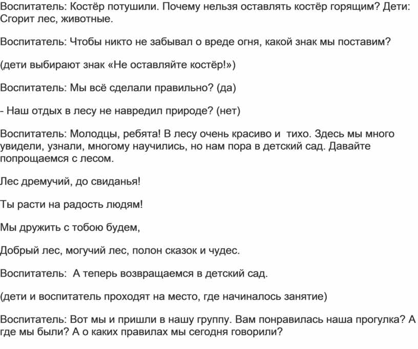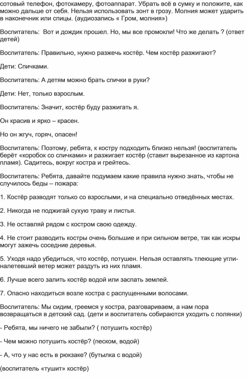 Воспитатель: Костёр потушили. Почему нельзя оставлять костёр горящим? Дети: Сгорит лес, животные.