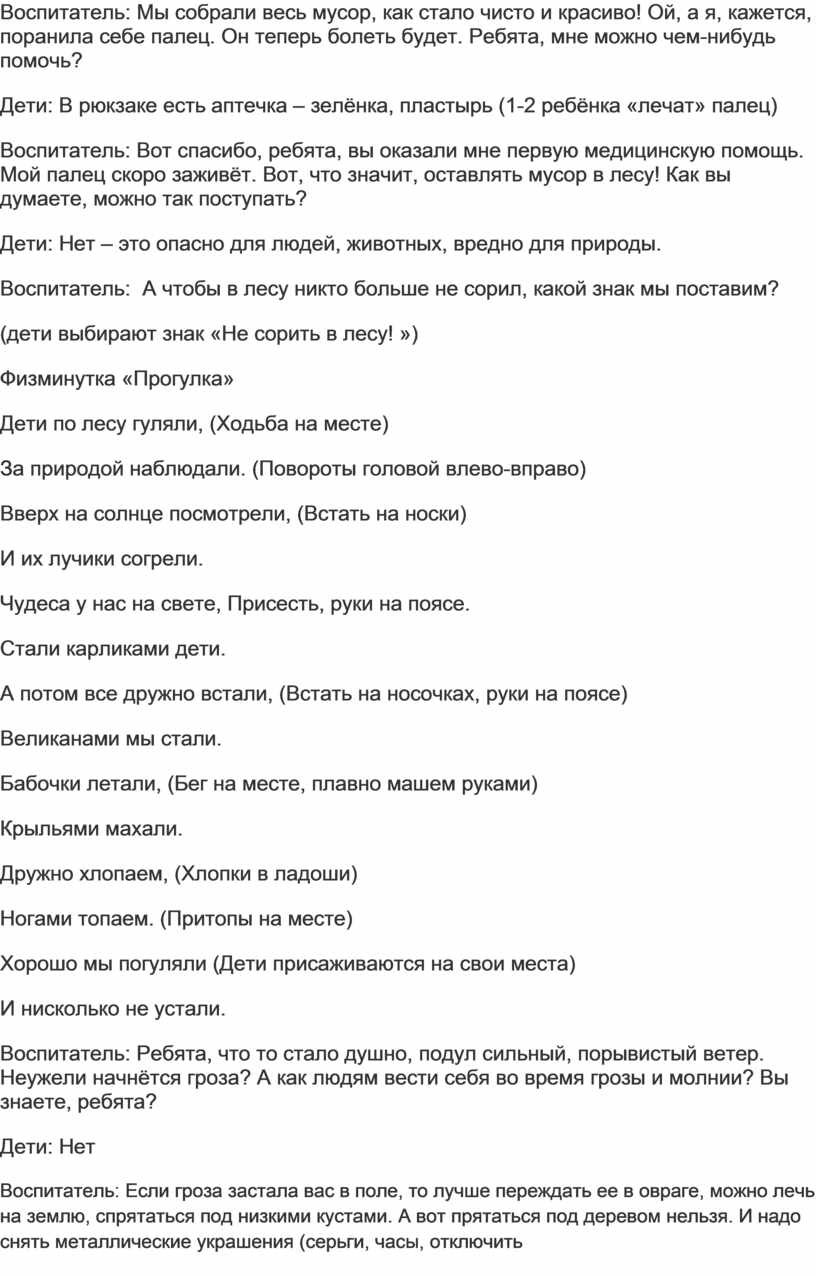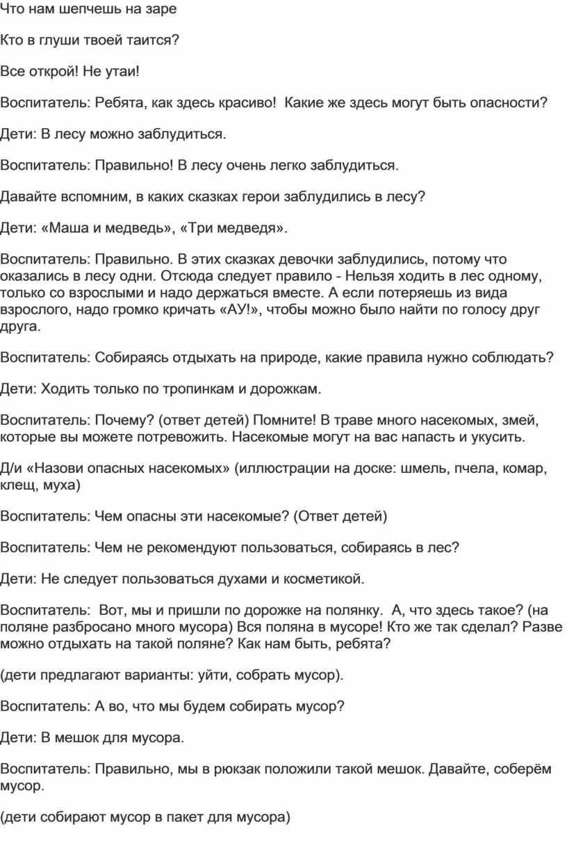 Воспитатель: Правильно. Вот и я вам предлагаю отправиться в лес, чтобы отдохнуть, подышать свежим воздухом, а также узнать, какие опасности могут подстерегать вас в лесу, на природе и как правильно нужно себя вести.
