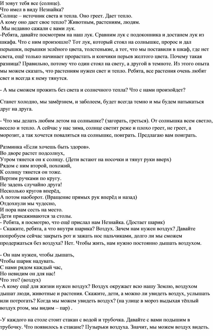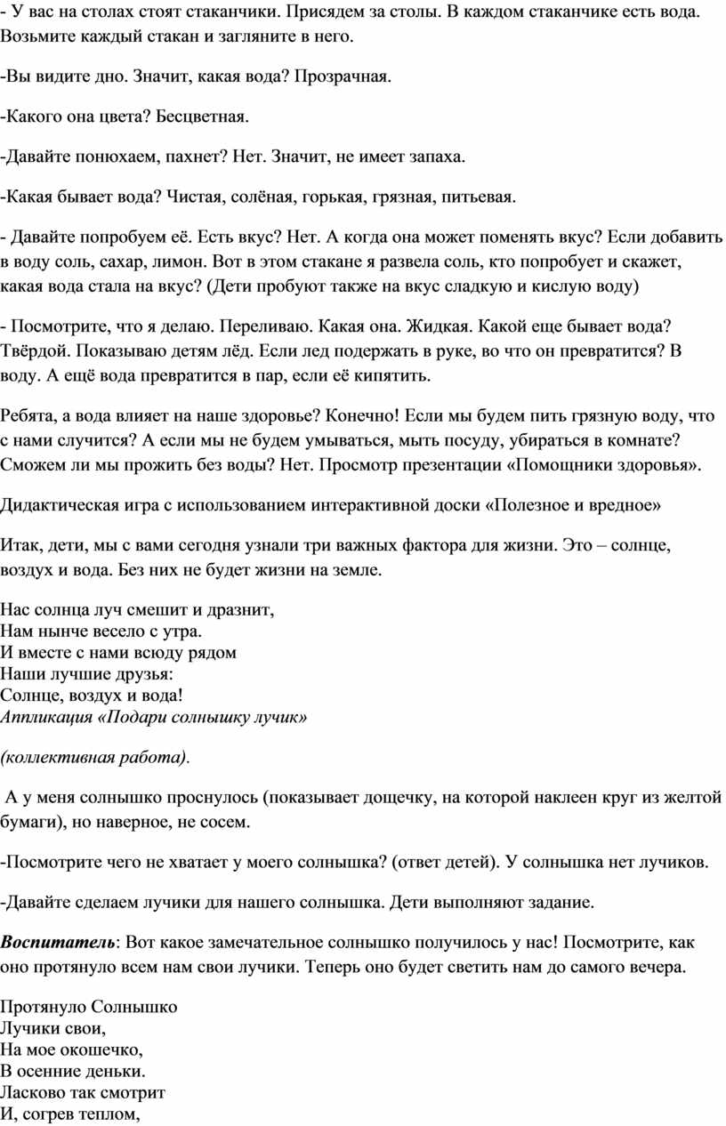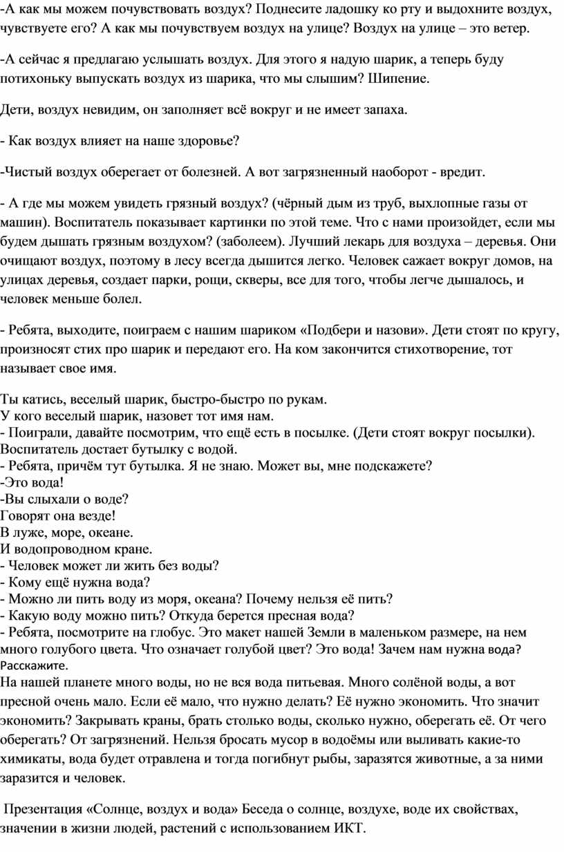 Предварительная работа: Разучивание потешек, разгадывание загадок, беседы с детьми о солнце, воздухе, воде их свойствах, значении в жизни людей, растений с использованием ИКТ.