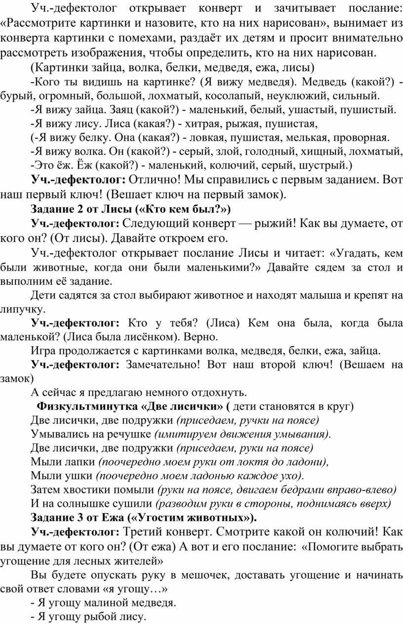 Уч.-дефектолог: Ребята, а кто же живёт в лесу? Ёж или нож? Лиза или лиса? Булка или белка? Мишка или миска? Майка или зайка? Волк или шёлк? (дети на мольберт вешаются изображения диких животных по ходу отгадывания)