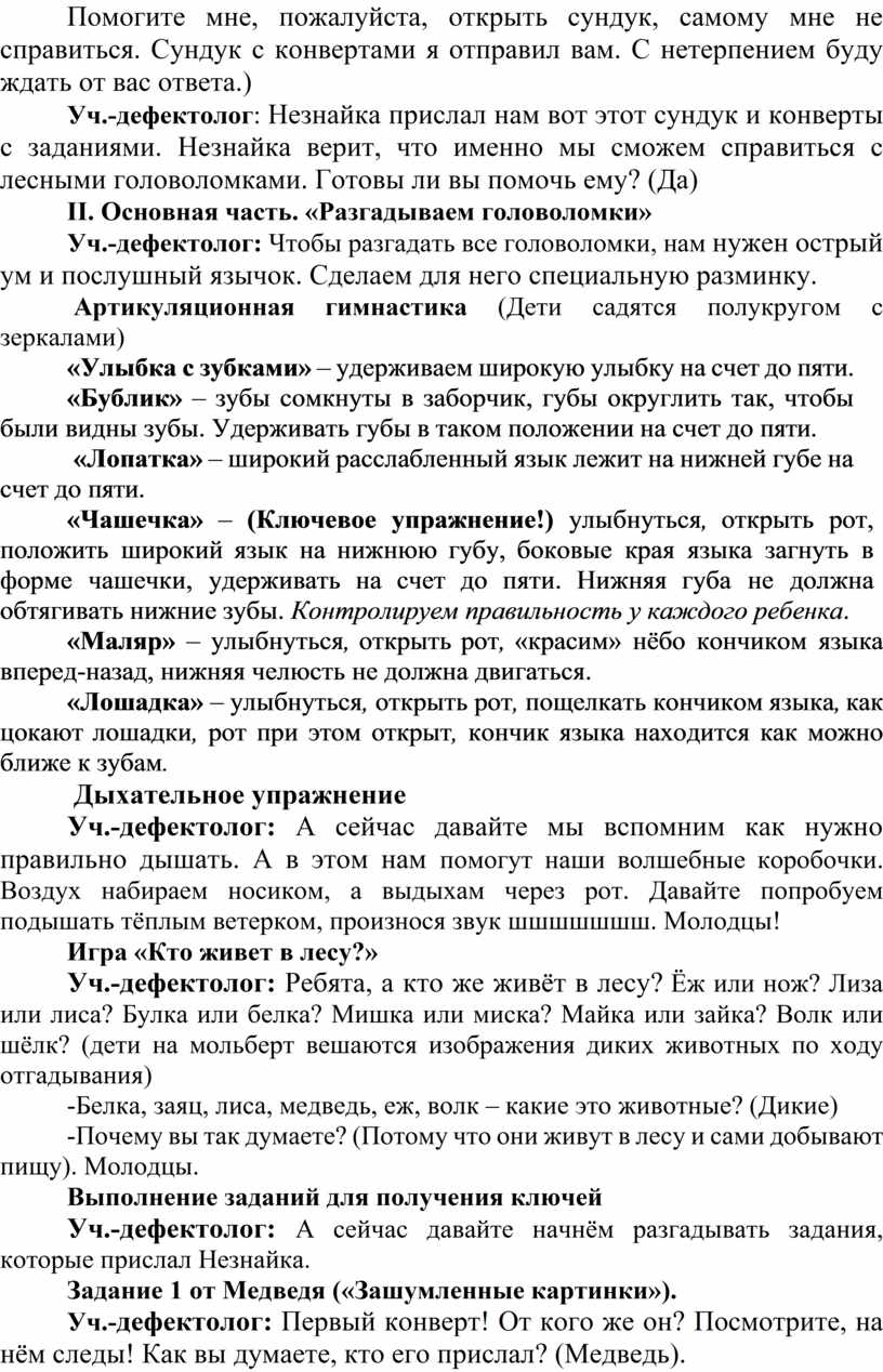 Уч.-дефектолог: Незнайка прислал нам вот этот сундук и конверты с заданиями. Незнайка верит, что именно мы сможем справиться с лесными головоломками. Готовы ли вы помочь ему? (Да)