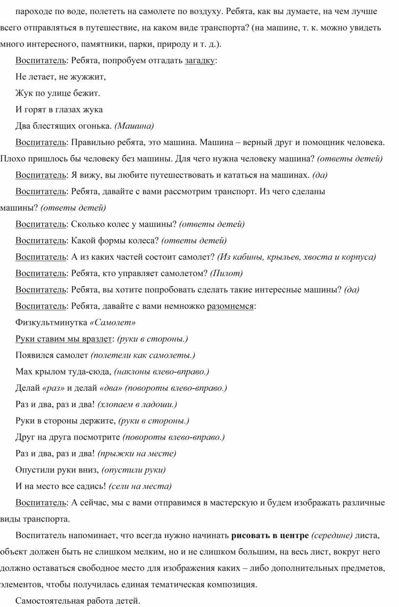 Воспитатель: А сейчас, мы с вами отправимся в мастерскую и будем изображать различные виды транспорта.