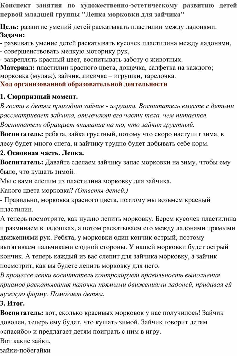 Конспект занятия по художественно-эстетическому развитию детей первой младшей группы "Лепка морковки для зайчика"