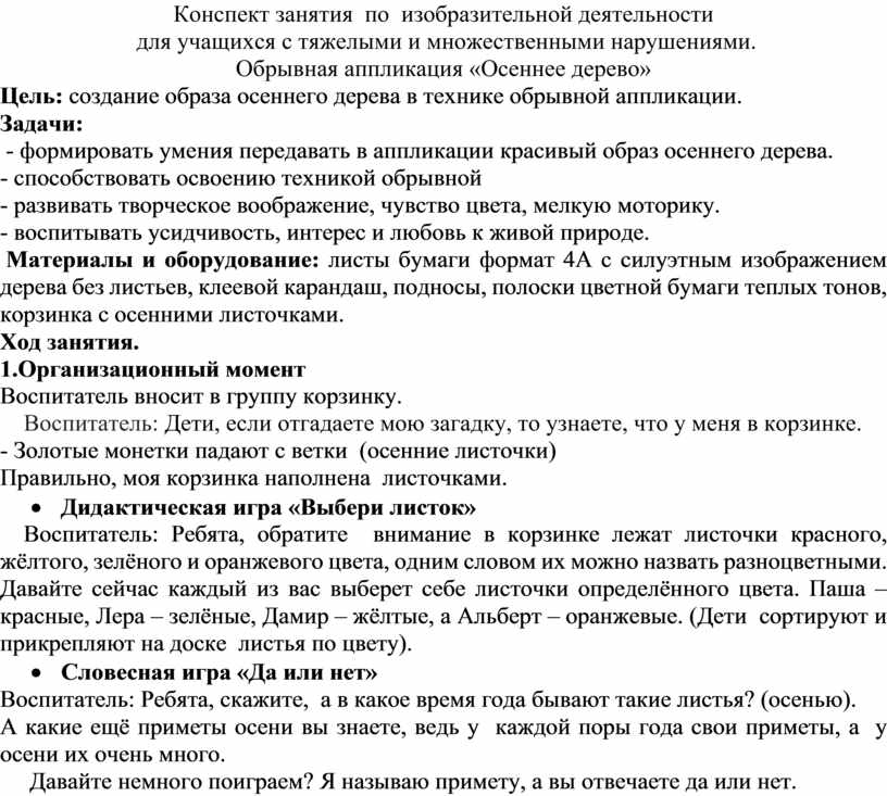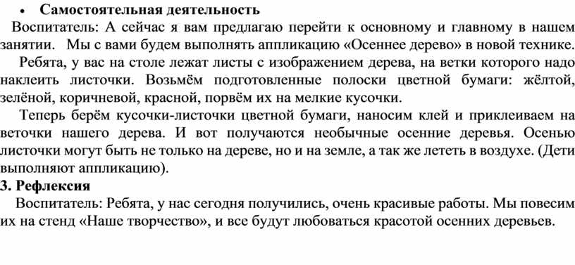 Воспитатель: А сейчас я вам предлагаю перейти к основному и главному в нашем занятии. Мы с вами будем выполнять аппликацию «Осеннее дерево» в новой технике.
