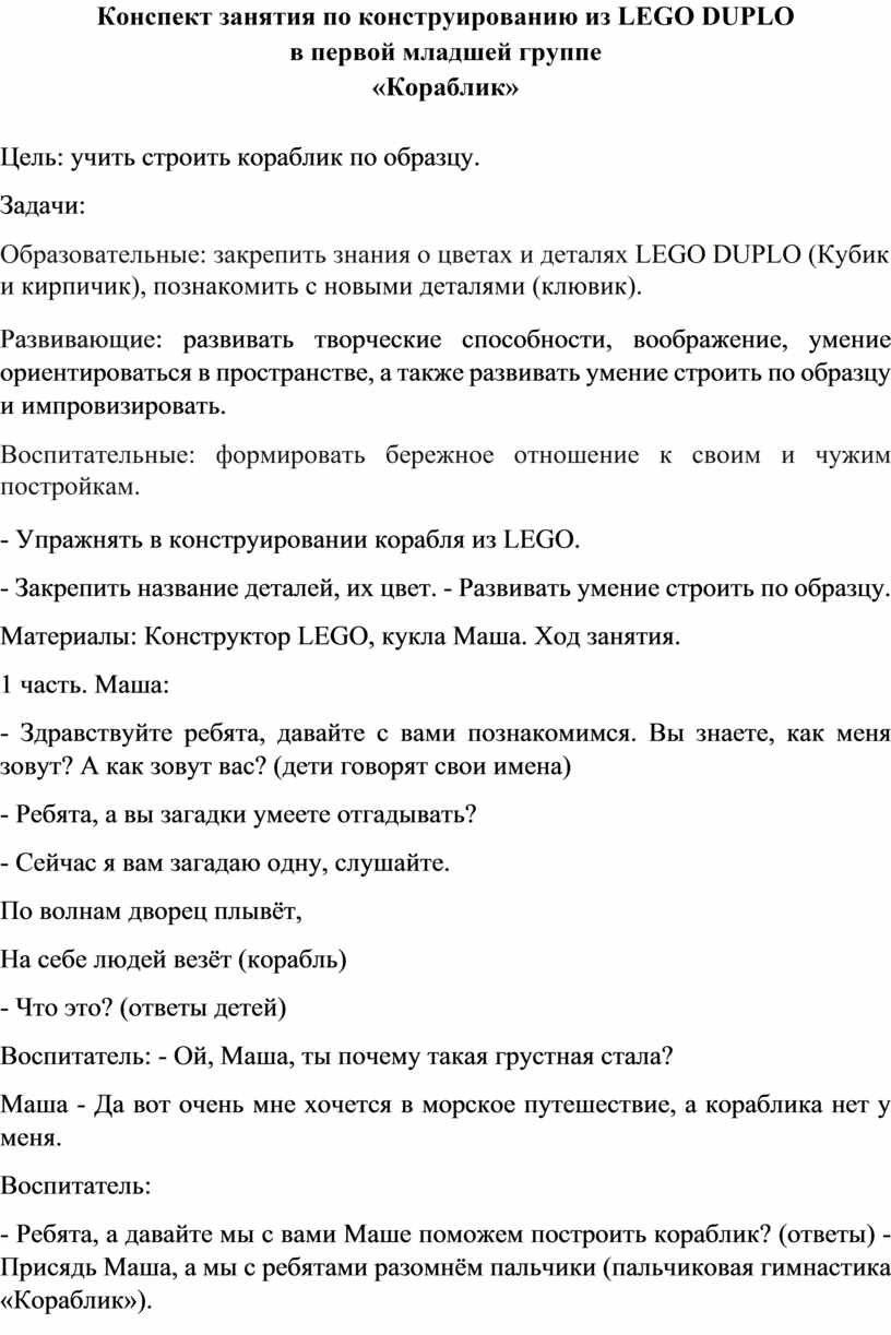 Материалы: Конструктор LEGO, кукла Маша. Ход занятия.