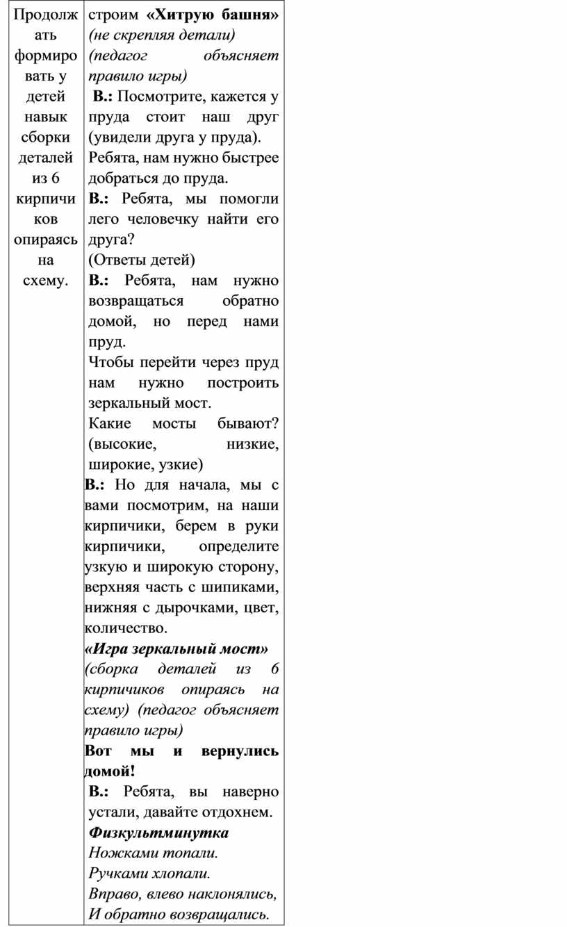 строим «Хитрую башня» (не скрепляя детали) (педагог объясняет правило игры) В.: Посмотрите, кажется у пруда стоит наш друг (увидели друга у пруда). Ребята, нам нужно быстрее добраться до пруда. В.: Ребята, мы помогли лего человечку найти его друга? (Ответы детей) В.: Ребята, нам нужно возвращаться обратно домой, но перед нами пруд. Чтобы перейти через пруд нам нужно построить зеркальный мост. Какие мосты бывают? (высокие, низкие, широкие, узкие) В.: Но для начала, мы с вами посмотрим, на наши кирпичики, берем в руки кирпичики, определите узкую и широкую сторону, верхняя часть с шипиками, нижняя с дырочками, цвет, количество. «Игра зеркальный мост» (сборка деталей из 6 кирпичиков опираясь на схему) (педагог объясняет правило игры) Вот мы и вернулись домой! В.: Ребята, вы наверно устали, давайте отдохнем. Физкультминутка Ножками топали. Ручками хлопали. Вправо, влево наклонялись, И обратно возвращались. |
