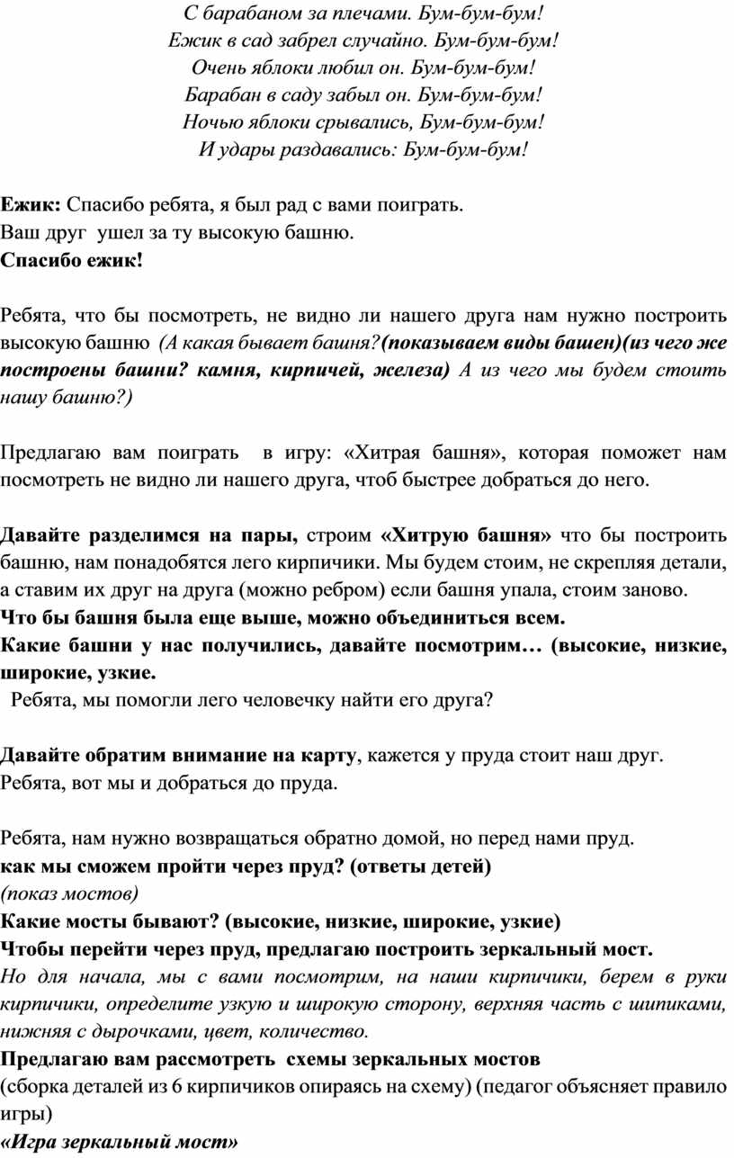 Ежик: Спасибо ребята, я был рад с вами поиграть. Ваш друг ушел за ту высокую башню. В.: Спасибо ежик! Ребята, что бы посмотреть, не видно ли нашего друга нам нужно построить высокую башню (А из чего мы будем стоить нашу башню? А какая бывает башня?) Предлагаю вам поиграть в игру: «Хитрая башня», которая поможет нам быстрее спуститься к пруду