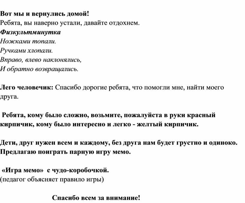 Лего человечик: Спасибо дорогие ребята, что помогли мне, найти моего друга. В.: Ребята, кому было сложно, возьмите, пожалуйста в руки красный кирпичик, кому было интересно и легко - желтый кирпичик. |