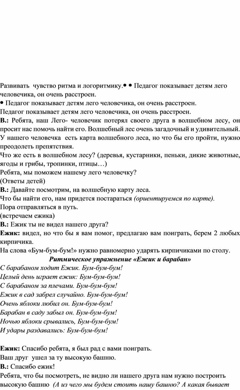 Педагог показывает детям лего человечика, он очень расстроен. В.: Ребята, наш Лего- человечик потерял своего друга в волшебном лесу, он просит нас помочь найти его. Волшебный лес очень загадочный и удивительный. У нашего человечка есть карта волшебного леса, но что бы его пройти, нужно преодолеть препятствия. Что же есть в волшебном лесу? (деревья, кустарники, пеньки, дикие животные, ягоды и грибы, тропинки, птицы…) Ребята, мы поможем нашему лего человечку? (Ответы детей) В.: Давайте посмотрим, на волшебную карту леса. Что бы найти его, нам придется постараться (ориентируемся по карте). Пора отправляться в путь. (встречаем ежика) В.: Ежик ты не видел нашего друга? Ежик: видел, но что бы я вам помог, предлагаю вам поиграть, берем 2 любых кирпичика. На слова «Бум-бум-бум!» нужно равномерно ударять кирпичиками по столу. Ритмическое упражнение «Ежик и барабан» С барабаном ходит Ежик. Бум-бум-бум!