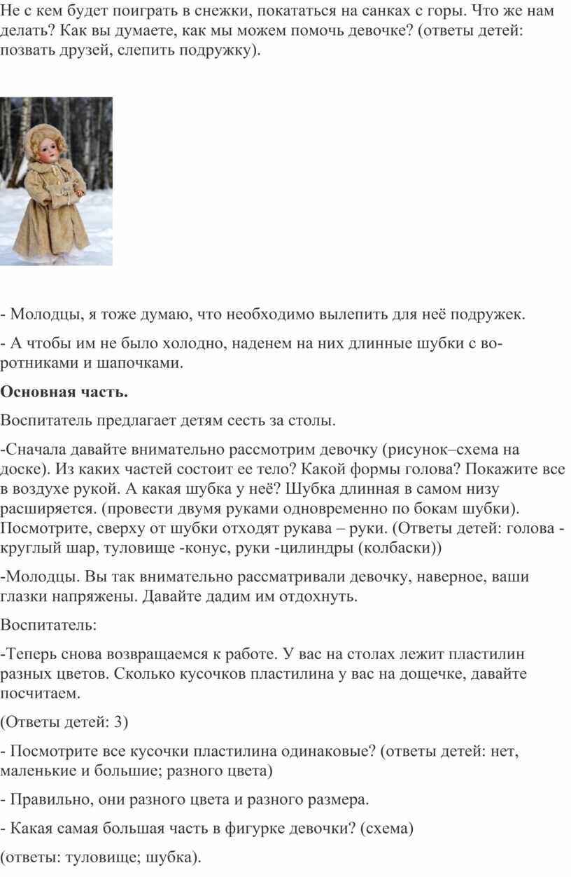 -Сначала давайте внимательно рассмотрим девочку (рисунок–схема на доске). Из каких частей состоит ее тело? Какой формы голова? Покажите все в воздухе рукой. А какая шубка у неё? Шубка длинная в самом низу расширяется. (провести двумя руками одновременно по бокам шубки). Посмотрите, сверху от шубки отходят рукава – руки. (Ответы детей: голова -круглый шар, туловище -конус, руки -цилиндры (колбаски))