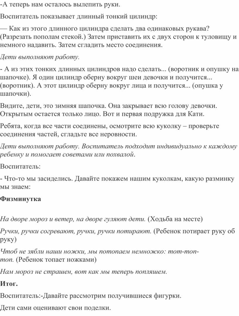 -С чего вы начнете лепить девочек? Конечно, с туловища, одетого в шубку. Посмотрите, как надо лепить шубку, чтобы внизу она была шире, чем вверху. Сначала раскатаете такой цилиндр (показывает заготовку). Потом верхнюю часть раскатаете под углом (показывает), раскатывайте по тоньше, чтобы она стала узкая, а другая часть широкая.