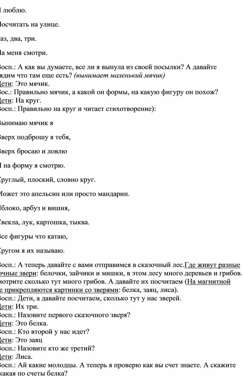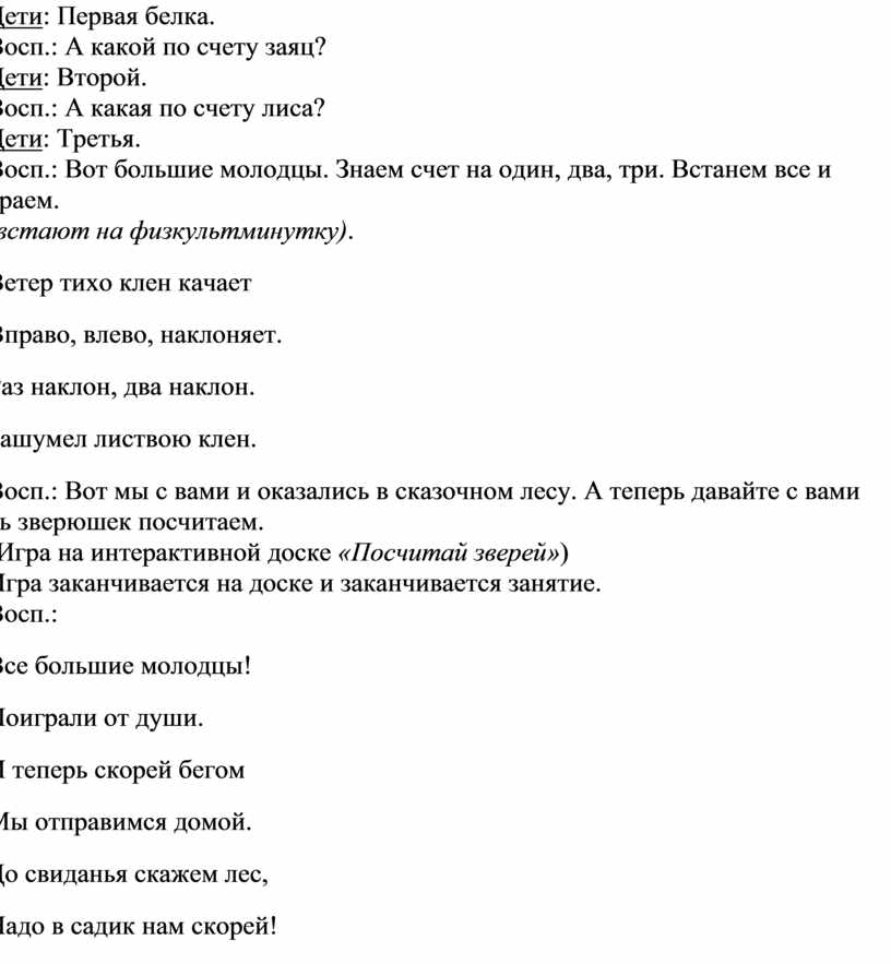 Восп.: А теперь давайте с вами отправимся в сказочный лес.Где живут разные сказочные звери: белочки, зайчики и мишки, в этом лесу много деревьев и грибов. Посмотрите сколько тут много грибов. А давайте их посчитаем (На магнитной доске прикрепляются картинки со зверями: белка, заяц, лиса).