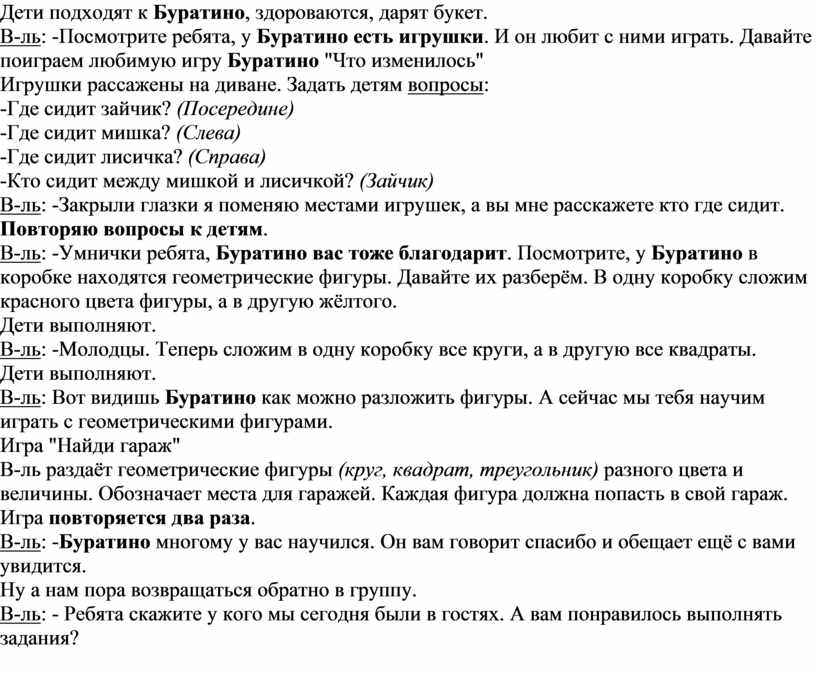 В-ль: Вот видишь Буратино как можно разложить фигуры. А сейчас мы тебя научим играть с геометрическими фигурами.