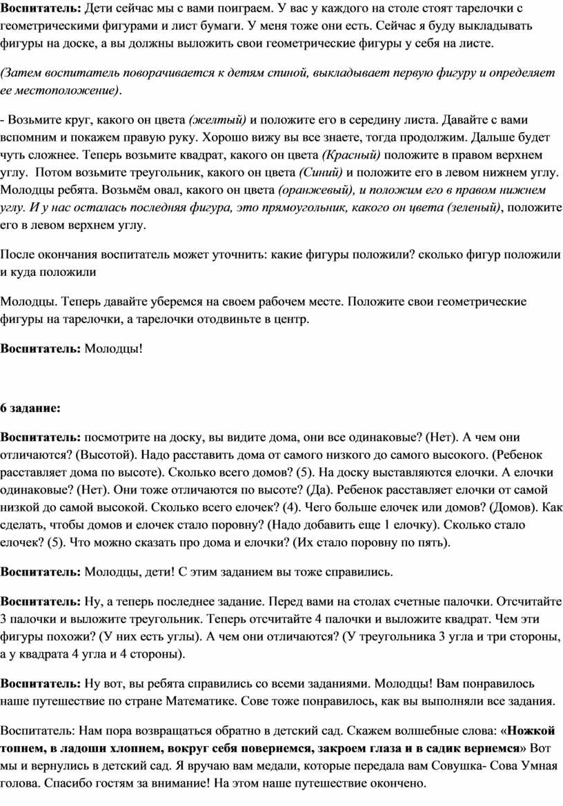 Воспитатель: Ну вот, вы ребята справились со всеми заданиями. Молодцы! Вам понравилось наше путешествие по стране Математике. Сове тоже понравилось, как вы выполняли все задания.