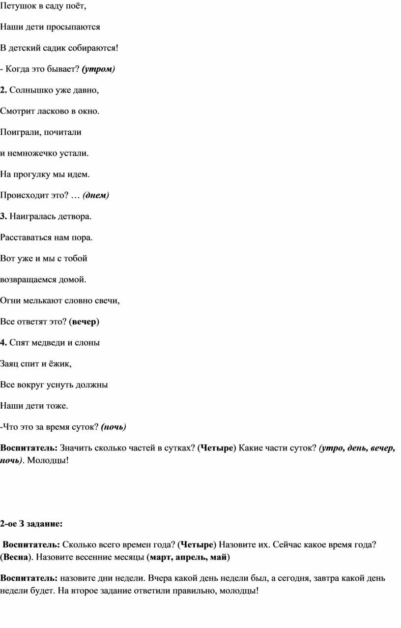 Воспитатель: Сколько всего времен года? (Четыре) Назовите их. Сейчас какое время года? (Весна). Назовите весенние месяцы (март, апрель, май)