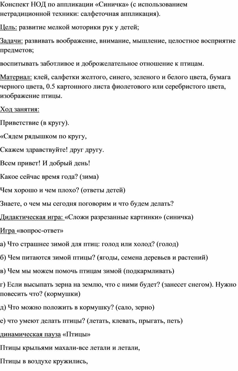 Конспект НОД по аппликации «Синичка» (с использованием нетрадиционной техники: салфеточная аппликация).
