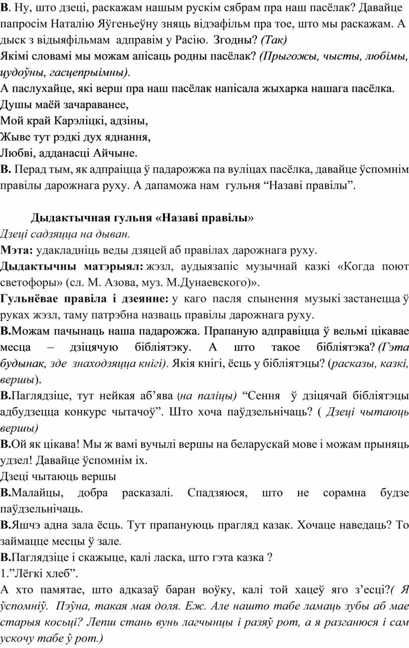 В. Перад тым, як адпраіцца ў падарожжа па вуліцах пасёлка, давайце ўспомнім правілы дарожнага руху. А дапаможа нам гульня “Назаві правілы”.
