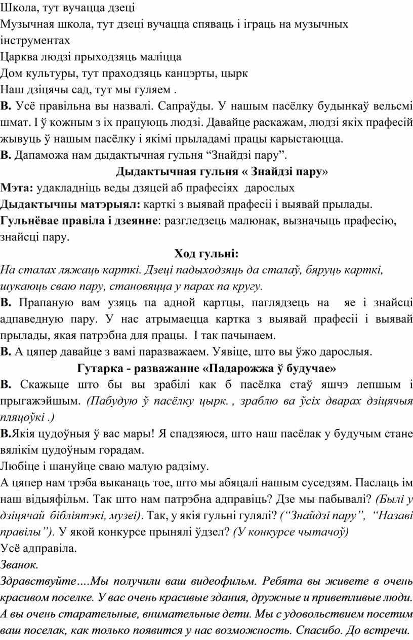 В. Ну, што дзеці, раскажам нашым рускім сябрам пра наш пасёлак? Давайце папросім Наталію Яўгеньеўну зняць відэафільм пра тое, што мы раскажам. А дыск з відыяфільмам адправім у Расію. Згодны? (Так)