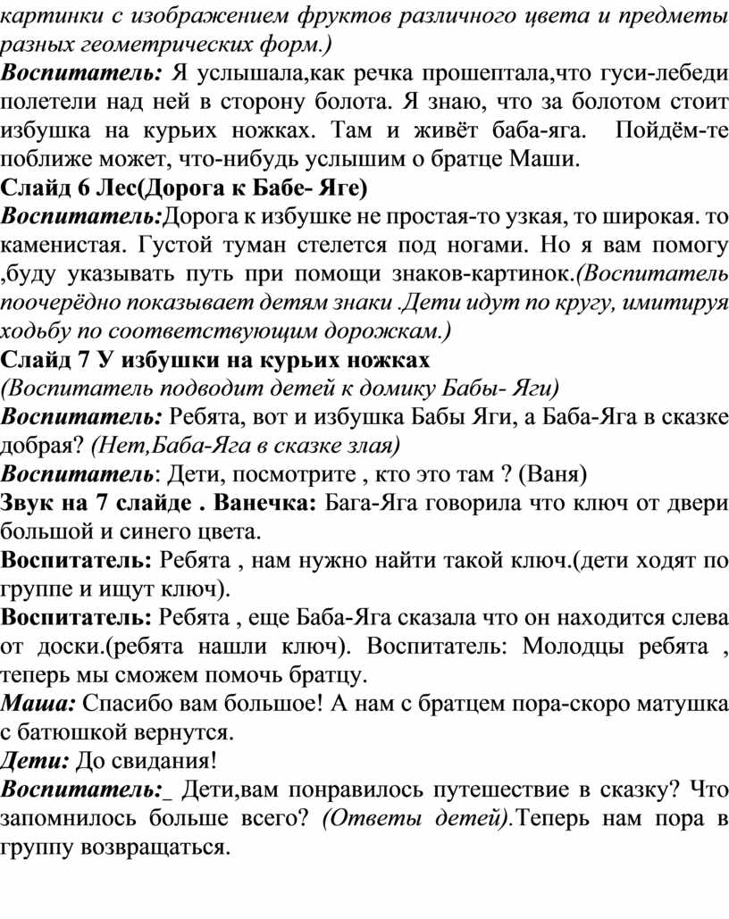 Воспитатель: Я услышала,как речка прошептала,что гуси-лебеди полетели над ней в сторону болота. Я знаю, что за болотом стоит избушка на курьих ножках. Там и живёт баба-яга. Пойдём-те поближе может, что-нибудь услышим о братце Маши.