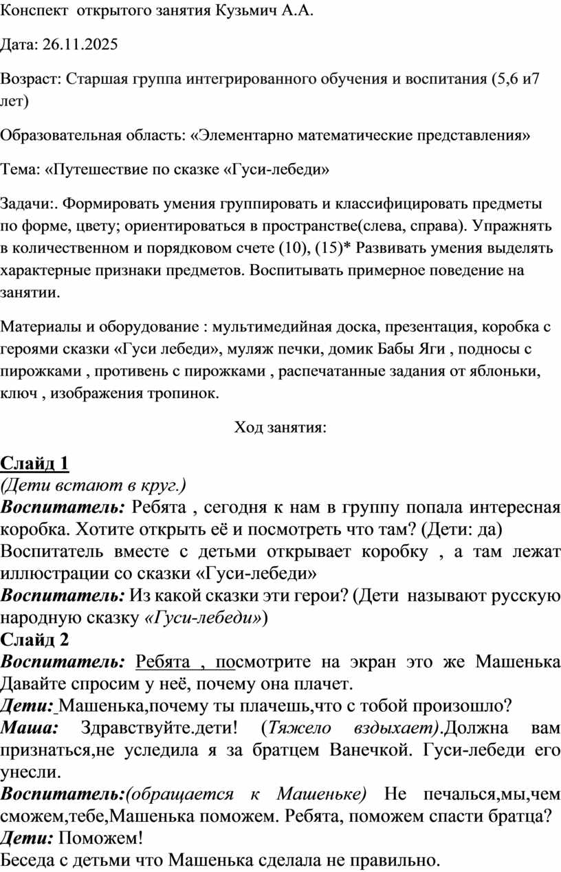 Воспитатель: Из какой сказки эти герои? (Дети называют русскую народную сказку «Гуси-лебеди»)