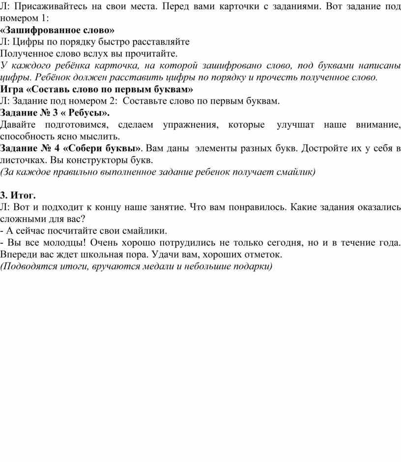 Л: Ребята, сегодня у нас необычное занятие. Необычное оно потому, что оно завершающее, последнее. Хочу поздравить вас с этим. Скоро вы пойдёте в школу, а сегодня вы покажете, чему научились, что узнали, выполнив задания, которые я вам приготовила. За каждое правильно выполненное задание вы будете получать смайлик. В конце занятия мы подсчитаем количество смайликов и определим, кто же был внимателен в течение всего года.