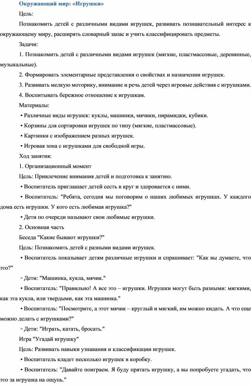 • Воспитатель: "Правильно! А все это – игрушки. Игрушки могут быть разными: мягкими, как эта кукла, или твердыми, как эта машинка."