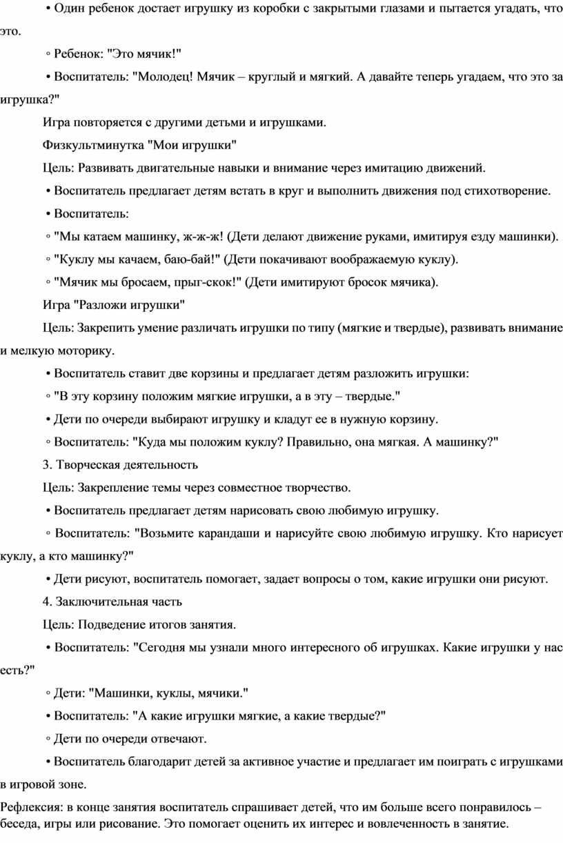 Рефлексия: в конце занятия воспитатель спрашивает детей, что им больше всего понравилось – беседа, игры или рисование. Это помогает оценить их интерес и вовлеченность в занятие.