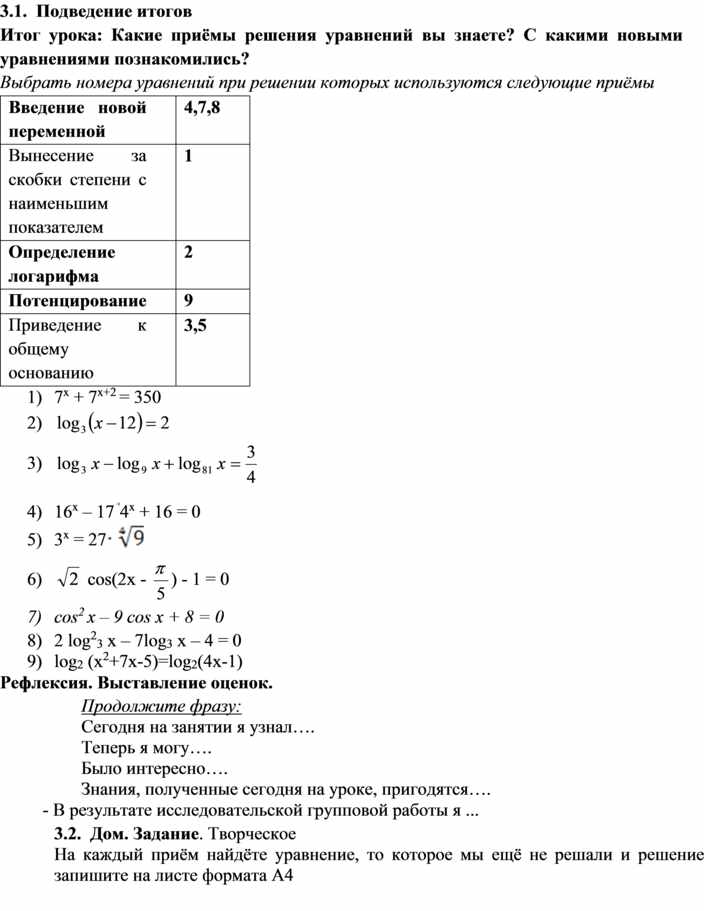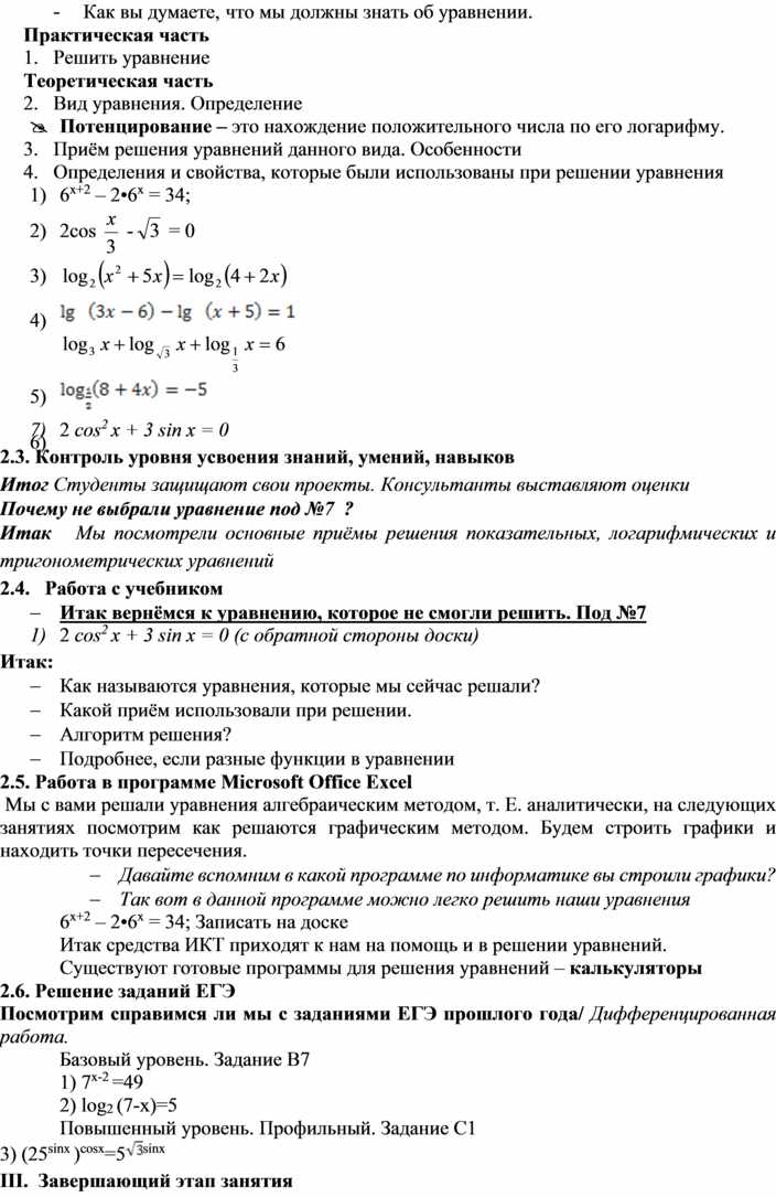 Цель занятия: формирование умения решать показательные, логарифмические и тригонометрические уравнения, используя разные приёмы