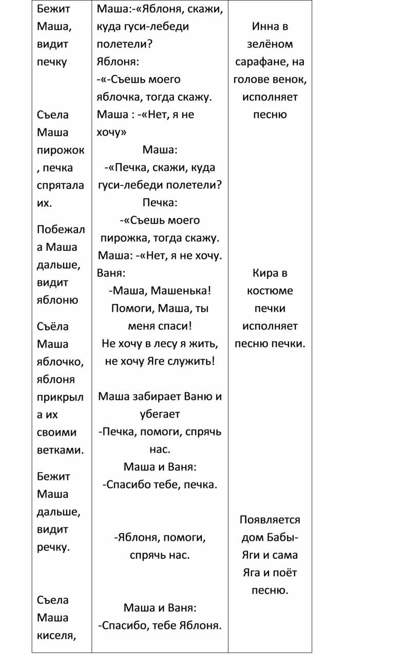 Маша:-«Яблоня, скажи, куда гуси-лебеди полетели? Яблоня: -«-Съешь моего яблочка, тогда скажу. Маша : -«Нет, я не хочу» Маша: -«Печка, скажи, куда гуси-лебеди полетели? Печка: -«Съешь моего пирожка, тогда скажу. Маша: -«Нет, я не хочу. Ваня: -Маша, Машенька! Помоги, Маша, ты меня спаси! Не хочу в лесу я жить, не хочу Яге служить!