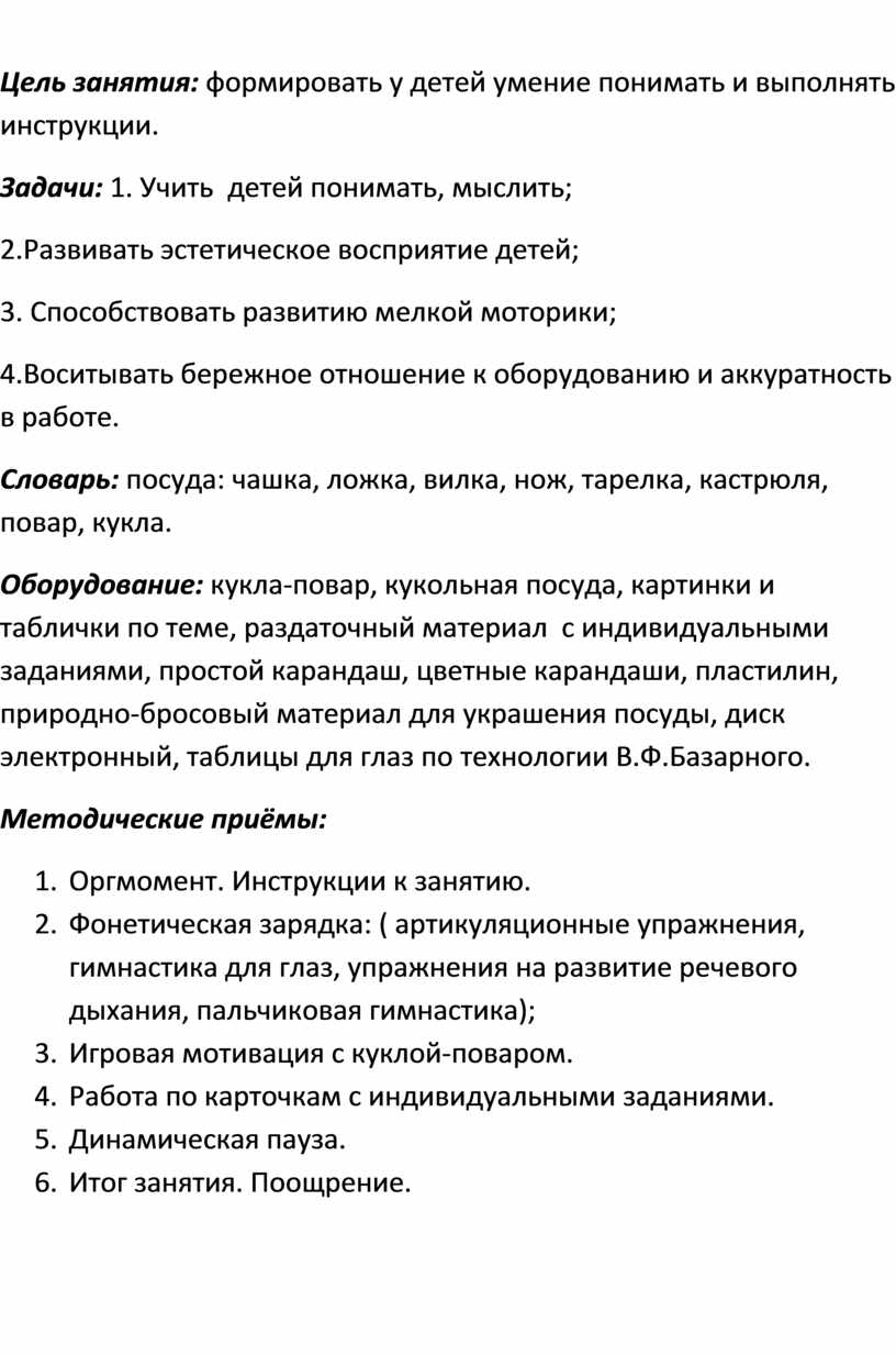 Оборудование: кукла-повар, кукольная посуда, картинки и таблички по теме, раздаточный материал с индивидуальными заданиями, простой карандаш, цветные карандаши, пластилин, природно-бросовый материал для украшения посуды, диск электронный, таблицы для глаз по технологии В.Ф.Базарного.