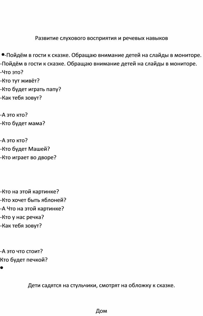 -Пойдём в гости к сказке. Обращаю внимание детей на слайды в мониторе. -Что это? -Кто тут живёт? -Кто будет играть папу? -Как тебя зовут?