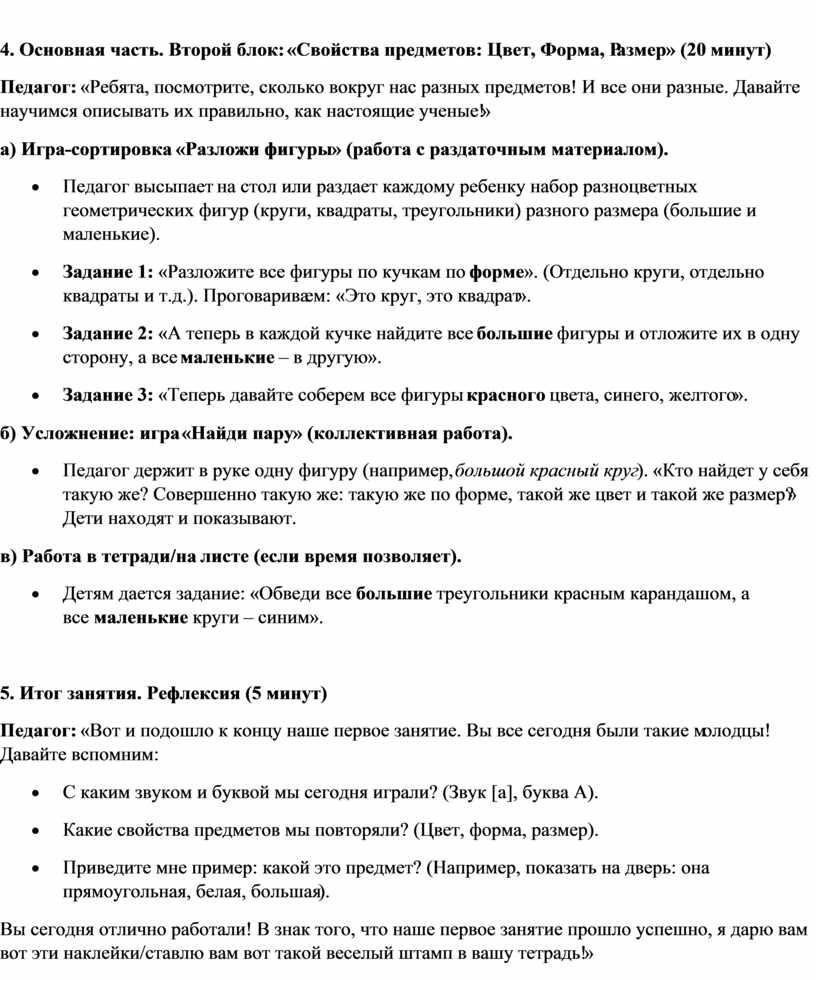 Основная часть. Второй блок: «Свойства предметов: Цвет, Форма, Размер» (20