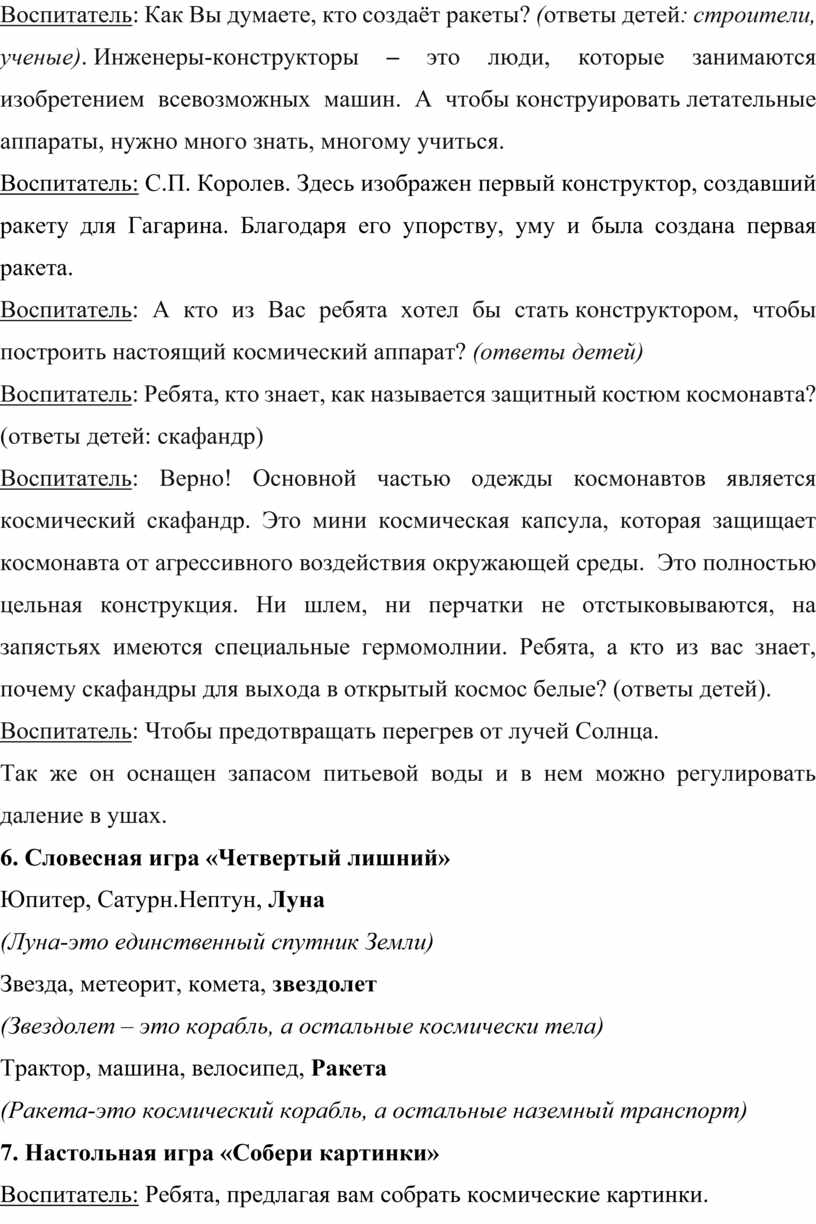 Воспитатель: Как Вы думаете, кто создаёт ракеты? (ответы детей: строители, ученые). Инженеры-конструкторы – это люди, которые занимаются изобретением всевозможных машин. А чтобы конструировать летательные аппараты, нужно много знать, многому учиться.
