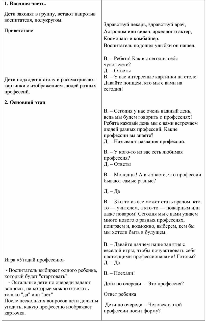 В. – Сегодня у нас очень важный день, ведь мы будем говорить о профессиях! Ребята каждый день мы с вами встречаем людей разных профессий. Какие профессии вы знаете? Д. – Называют названия профессий. В. – У кого-то из вас есть любимая профессия? Д. – Ответы В – Молодцы! А вы знаете, что профессии бывают самые разные? Д. – Да В. – Кто-то из вас может стать врачом, кто-то — учителем, а кто-то — пожарным или даже поваром! Сегодня мы с вами узнаем много нового о разных профессиях, поиграем и, возможно, выберем, кем бы мы хотели быть в будущем.
