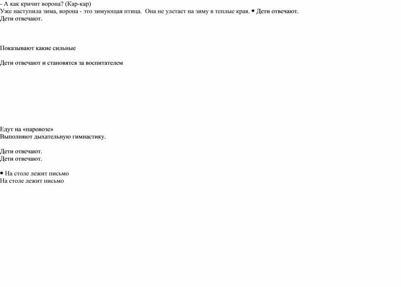 Ой, ребята, посмотрите, что это? ( Посмотрим от кого пришло письмо. А письмо нам прислала бабушка, из сказки «Репка». Она пишет: «Ребята, дедушка никак не может вытащить репку в огороде, помогите ему, пожалуйста». Ребята, покажите, какие вы сильные. Да вижу очень сильные. Значит можно отправляться в гости. А поедем мы на паровозе. Чтобы попасть на него необходимо слово отгадать. Кто первый назовет слово, тот и становится за мной. Начинаем: - слон большой, а мышка - … маленькая - кубик квадратный, а мяч- … круглый - лук горький, а сахар - … сладкий - волк злой, а зайчик -… добрый - зимой холодно, а летом - … тепло - днем светло, а ночью - … темно - яблоко сладкое, а лимон – … кислый - суп горячий, а мороженое – …холодное - шарик легкий, а камень - …тяжелый - человек идет медленно, а машина едет - … быстро Посмотрите, какой у нас поезд длинный получился. Поехали. Вот ребята мы и приехали на полянку. Сколько здесь цветов много. Понюхаем их аромат. Через нос делаем спокойный вдох, задерживаем дыхание и медленно выдыхаем. Ребята кто это у нас тут? Посмотрите, кто это сидит? - А ворона где сидит? (На дереве) - А как кричит ворона? (Кар-кар) Уже наступила зима, ворона - это зимующая птица. Она не улетает на зиму в теплые края. |