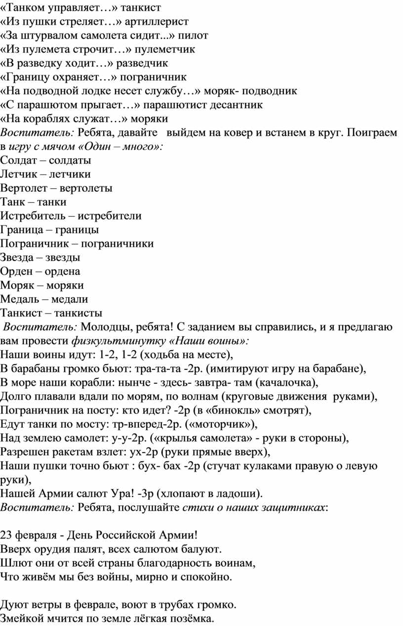Воспитатель: К нашей армии с большим уважением относятся во всех странах. Нашу армию уважают за то, что она никогда ни на кого не нападала. Наша армия состоит из большого количества различных войск: