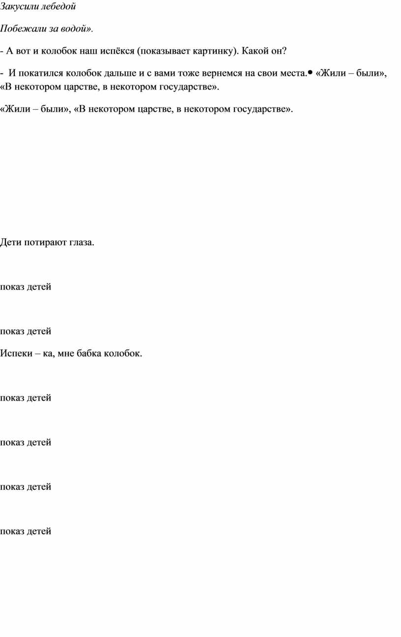 - «Жили - были дед и баба. Проснулся дед и потёр глаза. Покажите, как он потёр глаза? - Потянулся. Покажите, как он потянулся? - Зевнул. Как зевнул дед? - И говорит бабке… Что сказал бабке дед? - Замесила бабка тесто. Покажите, как бабка месила тесто… - Посолила - Сахаром посыпала - Маслом помазала - Скатала колобок и в печь поставила. - Пока колобок печётся, мы выйдем с вами на крылечко. И на дворе мы видим домашних птиц. Пальчиковая игра: «Куры, гуси да индюшки, Наклевались петрушки, Закусили лебедой Побежали за водой». - А вот и колобок наш испёкся (показывает картинку). Какой он? - И покатился колобок дальше и с вами тоже вернемся на свои места. |