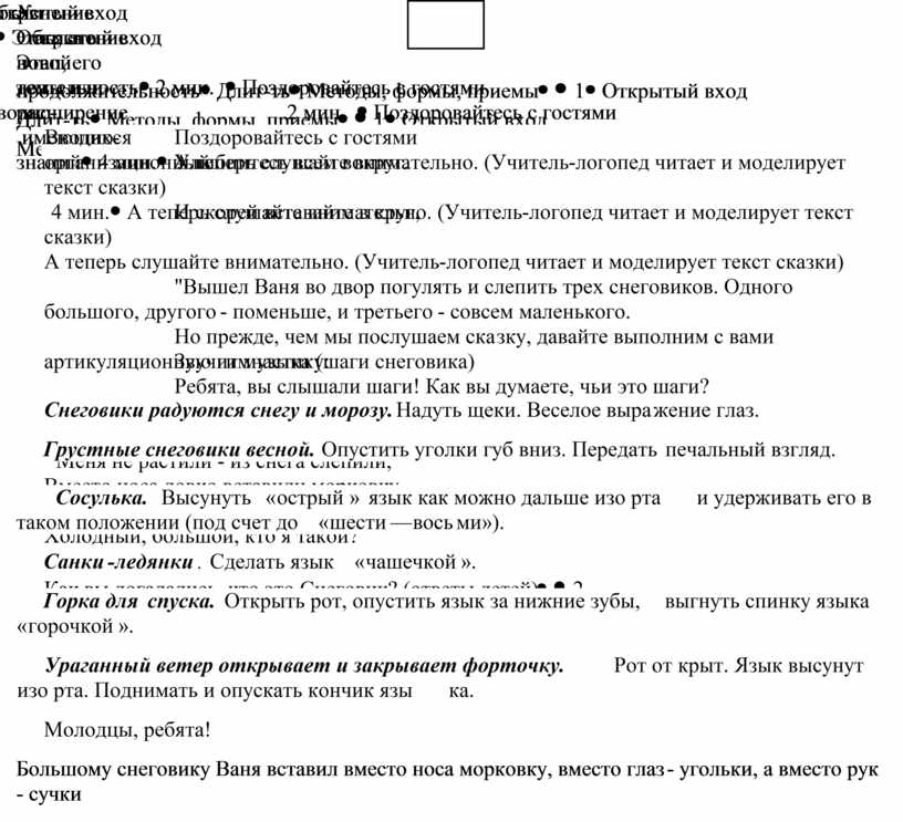 А сейчас садитесь на стульчики, я расскажу вам сказку «Про трёх снеговиков» (Дети рассаживаются за столы) Но прежде, чем мы послушаем сказку, давайте выполним с вами артикуляционную гимнастику: Снеговики радуются снегу и морозу. Надуть щеки. Веселое выражение глаз. Грустные снеговики весной. Опустить уголки губ вниз. Передать печальный взгляд. Сосулька. Высунуть «острый» язык как можно дальше изо рта и удерживать его в таком положении (под счет до «шести—восьми»). Санки-ледянки. Сделать язык «чашечкой». Горка для спуска. Открыть рот, опустить язык за нижние зубы, выгнуть спинку языка «горочкой». Ураганный ветер открывает и закрывает форточку. Рот открыт. Язык высунут изо рта. Поднимать и опускать кончик языка. Молодцы, ребята! |