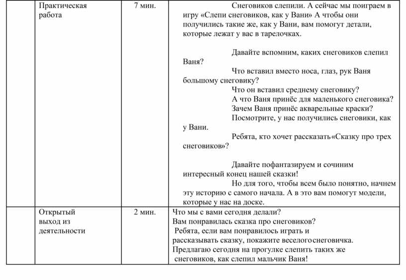 А теперь слушайте внимательно. (Учитель-логопед читает и моделирует текст сказки) "Вышел Ваня во двор погулять и слепить трех снеговиков. Одного большого, другого - поменьше, и третьего - совсем маленького. Большому снеговику Ваня вставил вместо носа морковку, вместо глаз - угольки, а вместо рук - сучки дерева. Среднему снеговику морковка не досталась, и вместо носа Ваня вставил ему палочку, вместо глаз - камешки, а вместо рук - небольшие снежные комочки. А для маленького снеговика Ваня принес яркое пластмассовое ведерко и надел его на голову, а на шею повязал старый мамин шарф. Затем Ваня принес свои акварельные краски и нарисовал снеговику глаза, нос и румяные щечки. |