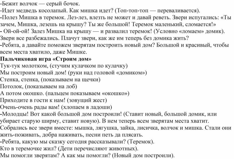 - Ой-ой-ой! Залез Мишка на крышу — и развалил теремок! (Условно «ломаем» домик). Звери все разбежались. Плачут звери, как же им теперь без домика жить?
