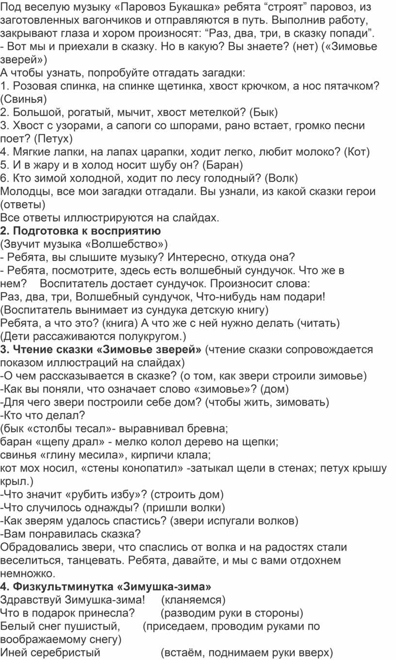 Материал: сундучок, книга «Зимовье зверей», мультимедийный проектор записи музыки «Зима» Чайковского, «Волшебство», звуки паровоза, заготовки вагончиков и локомотива, музыка «Паровоз букашечка», презентация к сказке, смайлики.